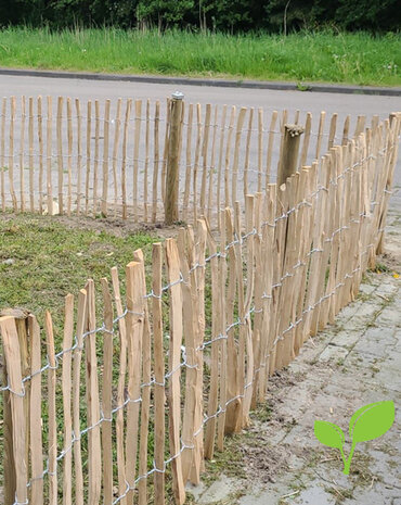 plaatsen met behulp van ronde palen en krammen of schroeven. Schroef of spijker de latjes vast tegen de palen. De palen zet u om de 1 of anderhalve meter goed vast in de grond (minstens ⅓ van de lengte). Omdat de constructie zo flexibel is, vormen bochten, hoeken en/of niveauverschil in de ondergrond geen probleem!