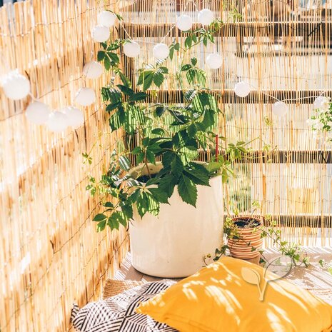 De rietmat is gemaakt van gepelde zoetwaterrietstengels die met zwart, geplastificeerd ijzerdraad zijn gebonden. Met 50% zichtdichtheid biedt deze mat weinig privacy. Kies daarvoor liever een andere natuurmat of breng een dubbel laag aan van de gepelde rietmat.